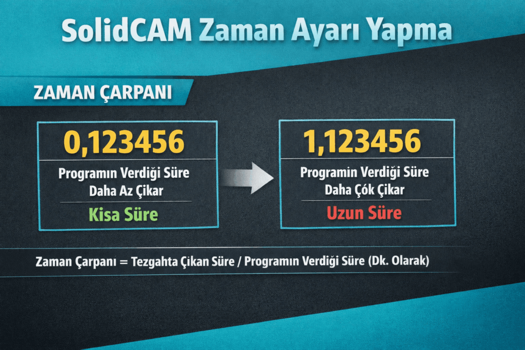 SolidCAM’de bulunan Zaman Çarpanı, programın hesapladığı süre ile tezgâhta ölçülen gerçek süreyi birbirine yaklaştırmak için kullanılan basit ama etkili bir ayardır.